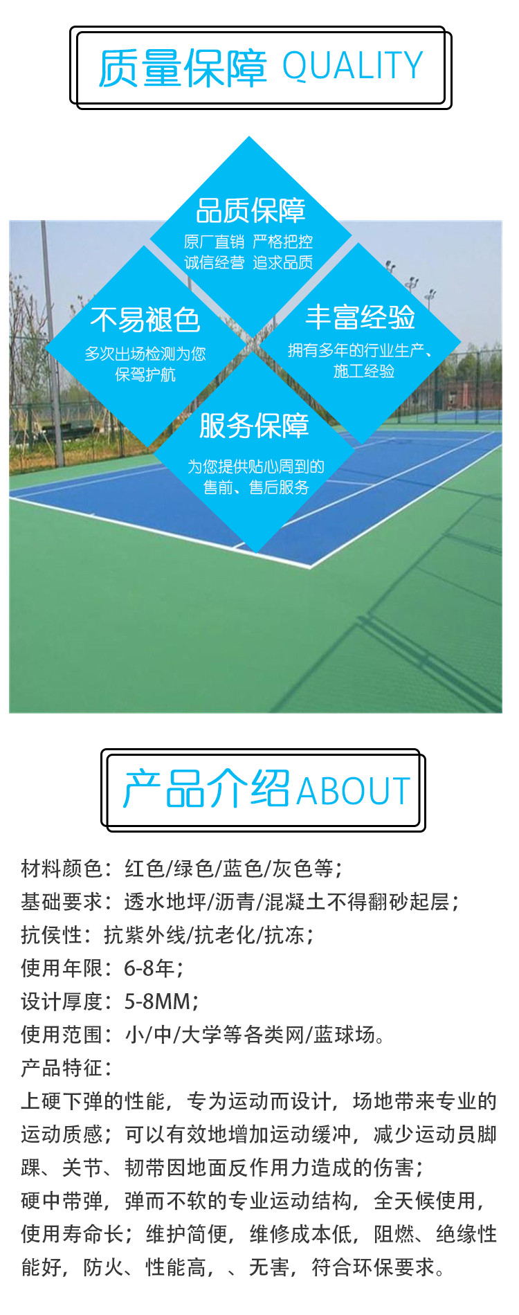 基礎要求:透水地坪/瀝青/混凝土不得翻砂起層;抗侯性:抗紫外線/化/抗凍;使用年限:6-8年;設計厚度:5-8mm;使用范圍:小/中/大學等各類網/藍球場。產品特征:上硬下彈的性能,專為運動而設計,場地帶來的運動質感;可以有效地運動緩沖,運動員腳踝、關節、韌帶因地面反作造成的傷害;硬中帶彈,彈而不軟的運動結構,全天候使用,使用壽命長;簡便,成本低,阻燃、絕緣性能好,防火、性能高,、無害,符合要求。