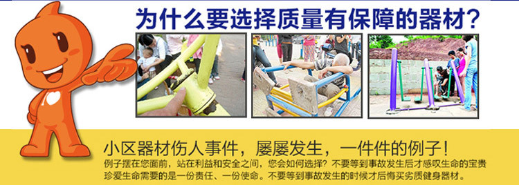 3、第三類是其他無任何活動性零部件的穩固性器材。如固定式踏樁、平衡木(實際上是鋼鐵部件)、固定式的階梯、攀巖墻、仰臥起坐床等,由于不存在各部件的磨損、碰撞等現象,在戶外環境并同樣設定在基本無人日常管理的使用條件下,自2011年10月1日期實施室外健身器材新**標準所有器材的安全使用年限為8年。