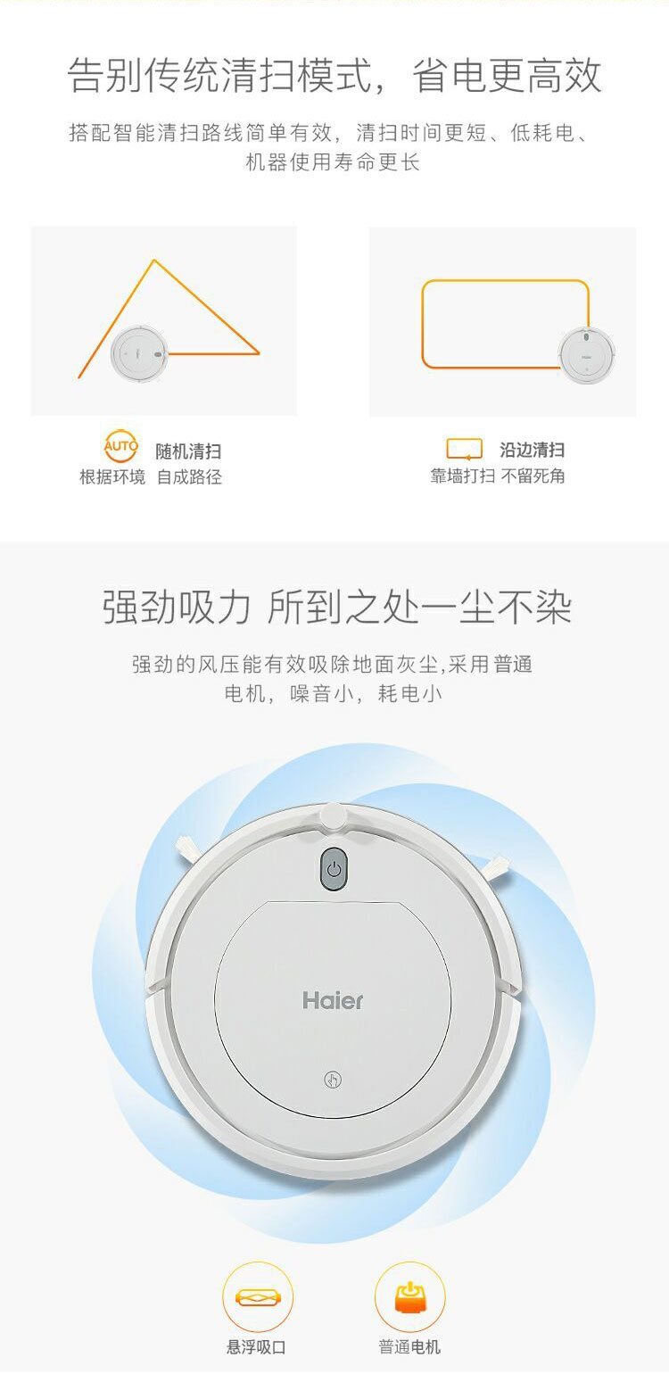 這款機(jī)器噪音非常的小,享受寧靜干凈的生活。能根據(jù)環(huán)境自成路徑,靠墻打掃,沒有死角可言。底部還有防跌落的感應(yīng)眼睛,智能識別復(fù)雜的地形,保護(hù)機(jī)器及時(shí)調(diào)頭,防止跌落受損。前驅(qū)感應(yīng)防撞體統(tǒng),根據(jù)現(xiàn)場的環(huán)境能夠及時(shí)的改變路線,有效地保護(hù)您的家具和機(jī)器本身。機(jī)身厚度僅7.2cm,解決了機(jī)身被門檻、家具卡住的問題,適用于木質(zhì)地板、瓷磚、短毛地毯、大理石等等常見的家居環(huán)境。海爾專注研發(fā)家電多年,值得信賴。