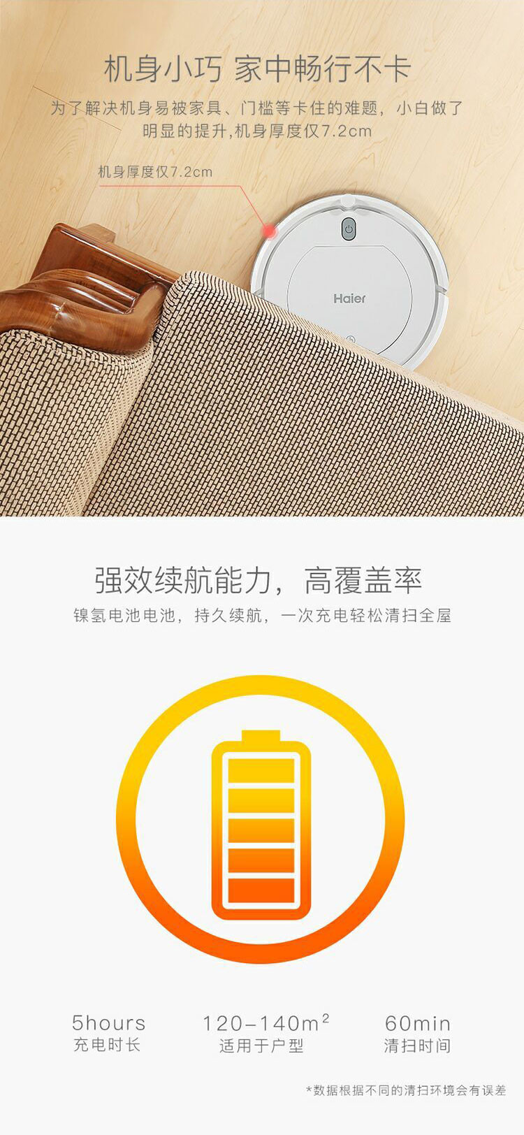 140平的房屋可以一次輕松掃全屋,充電時(shí)長5小時(shí)。