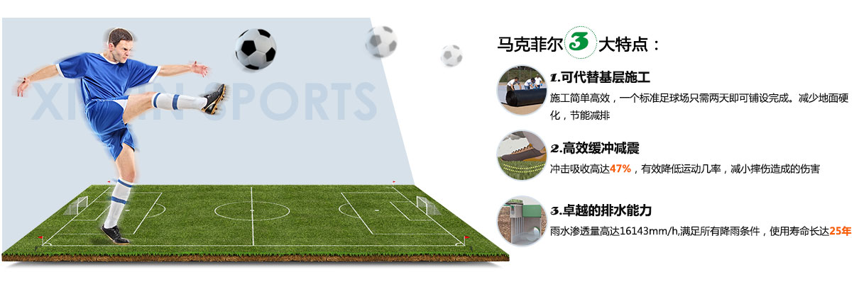 馬克菲爾足球場多功能基層墊是一款專用于人造草足球場的基礎墊層,以其卓越的性能和創(chuàng)新的系統(tǒng)設計滿足最高端的場地要求。是一款徹底顛覆傳統(tǒng)足球場基礎建造方案的革命性產品。其多功能表現(xiàn)為:可替代水泥和瀝青基礎,高效緩沖減震以及卓越的排水能力和球場穩(wěn)定性。