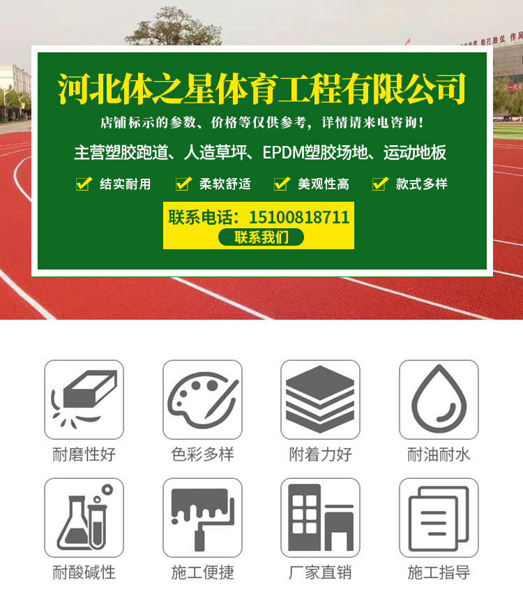 主營透氣型跑道材料、混合型跑道材料、三元乙丙橡膠顆粒材料、硅PU球場材料、PU塑膠材料、預制型卷材、人造草坪TPE顆粒等