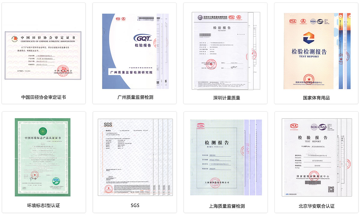 塑膠跑道獲得:中國田徑協(xié)會審定證書、廣州質(zhì)量監(jiān)督檢測、深圳計量質(zhì)量、國家體育用品、環(huán)境標(biāo)志I型認(rèn)證、SGS、上海質(zhì)量監(jiān)督檢測、北京華安聯(lián)合認(rèn)證等。