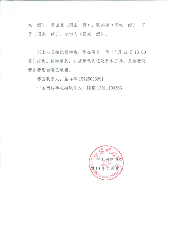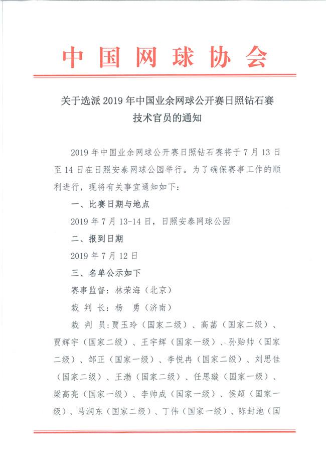關于選派2019年中國業余網球公開賽日照鉆石賽技術官員的通知