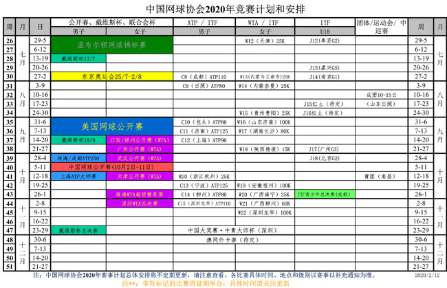 中國網球協會2020年競賽計劃和安排