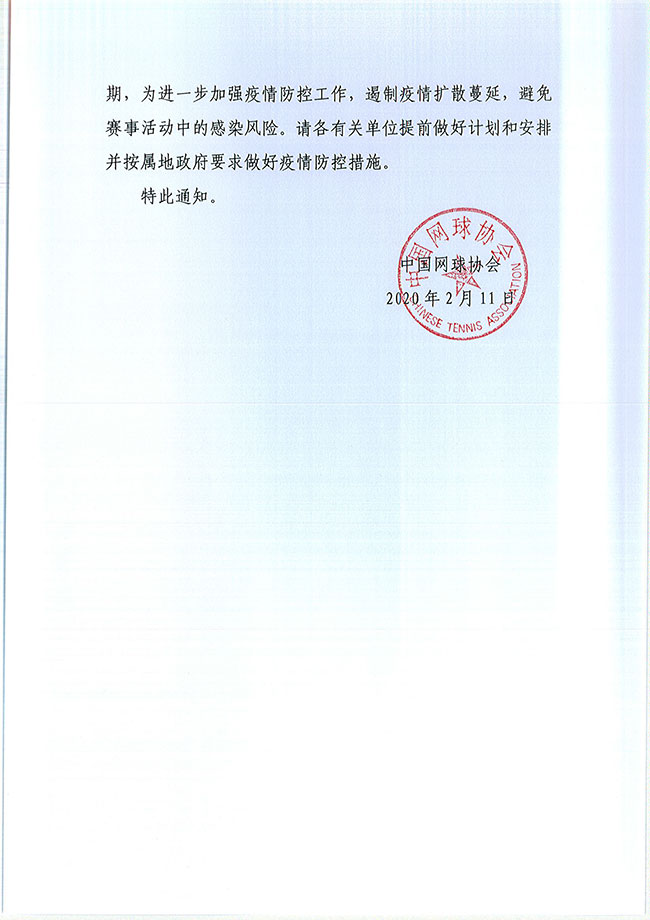 中國網球協會關于延期和取消舉辦4月份賽事的通知